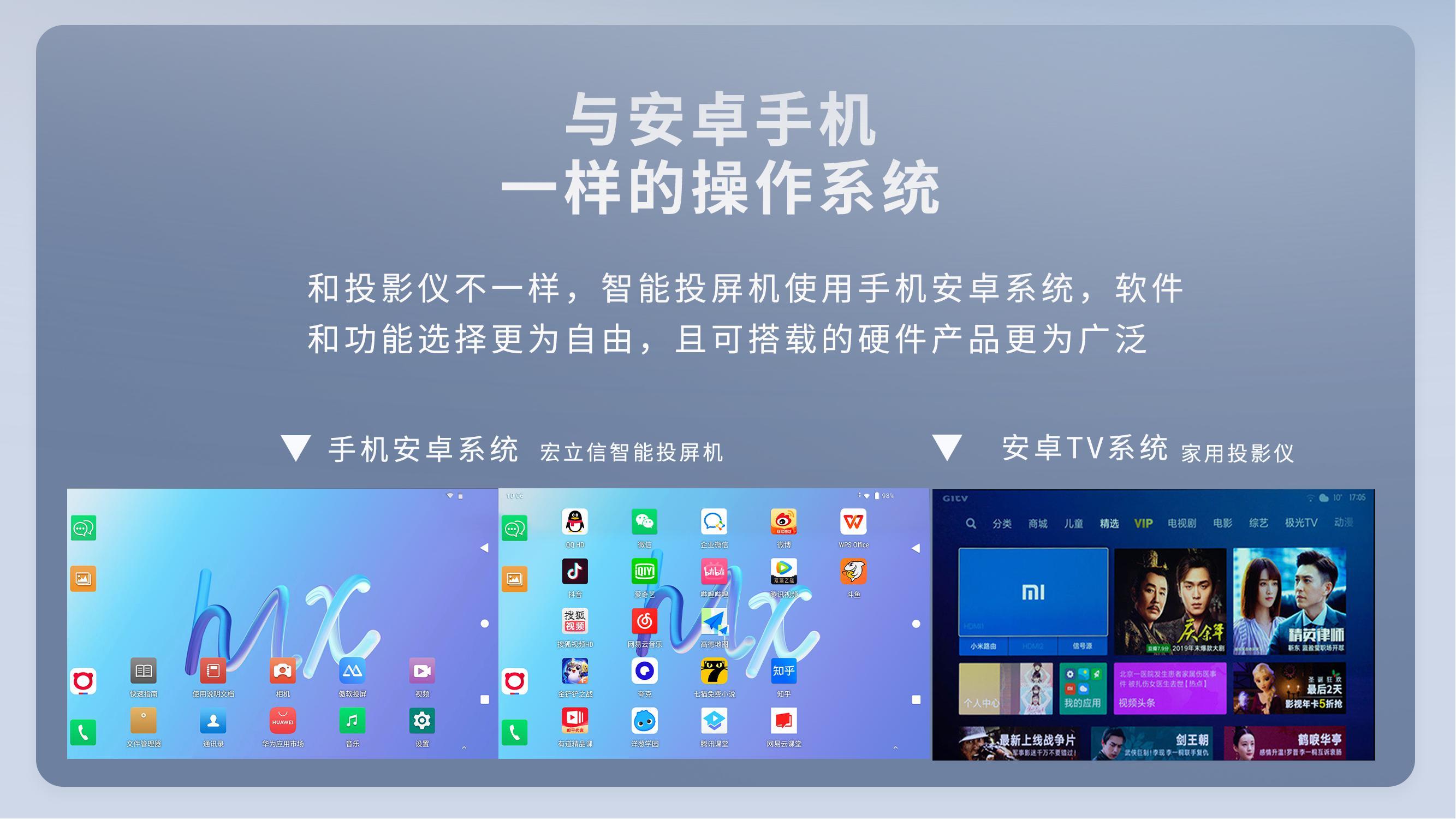 許多人還是沒了解宏立信智能投屏機是一款什么樣的產品,它和投影儀有什么區別,為什么智能投屏機可以做到更多的功能,展示更好的畫質,更值得擁有呢?
