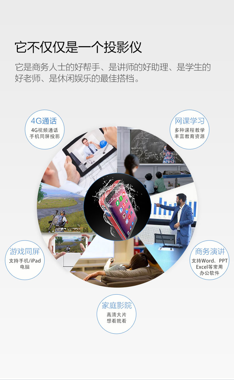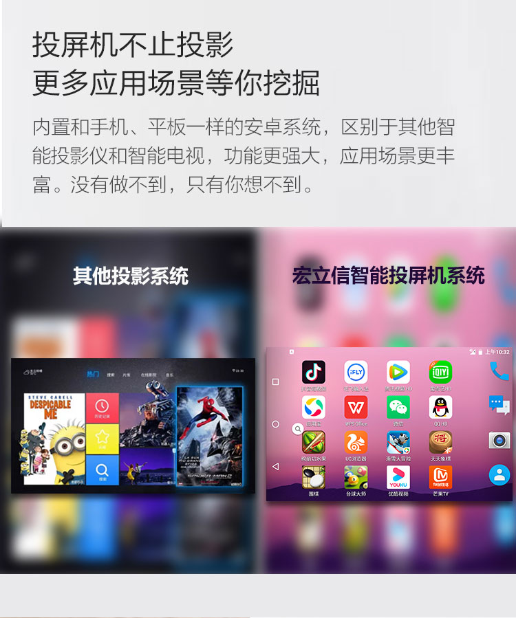 智能投屏機是一臺將平板電腦+手機+投影儀集合一體的一機多用型智能產品,可作為平板電腦、手機、投影儀、投屏器、電視、游戲機、學習機等等使用。